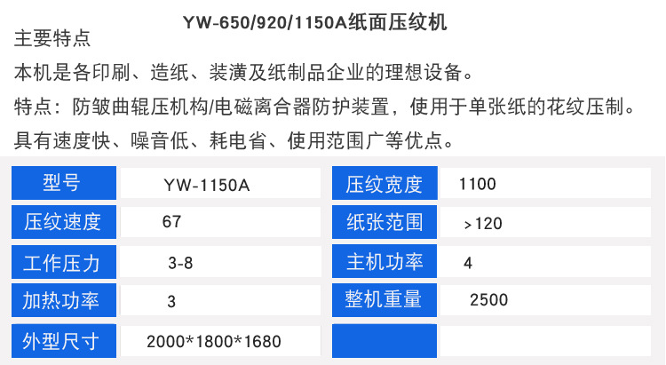 ?本機(jī)是各印刷、造紙、裝潢及紙制品企業(yè)的理想的后道加工設(shè)備。防皺曲輥壓機(jī)構(gòu)/電磁高合器防護(hù)裝置,適用于單張紙的花紋壓制。具有速度快、噪音低、耗電省、使用范圍廣等優(yōu)點(diǎn)。